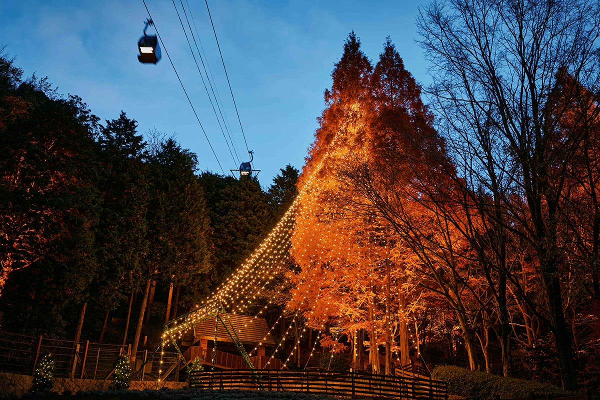 なかでも特に注目を集めるのが、約1,600球の電球でデコレーションされた高さ25mのメタセコイアのツリーです。存在感も幻想的な美しさも一般的なクリスマスツリーとは一線を画していますよ♪ イベント開催時期は紅葉の季節も重なり、昼夜問わず楽しめるのもおすすめポイント。紅葉のライトアップも見逃せません。