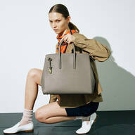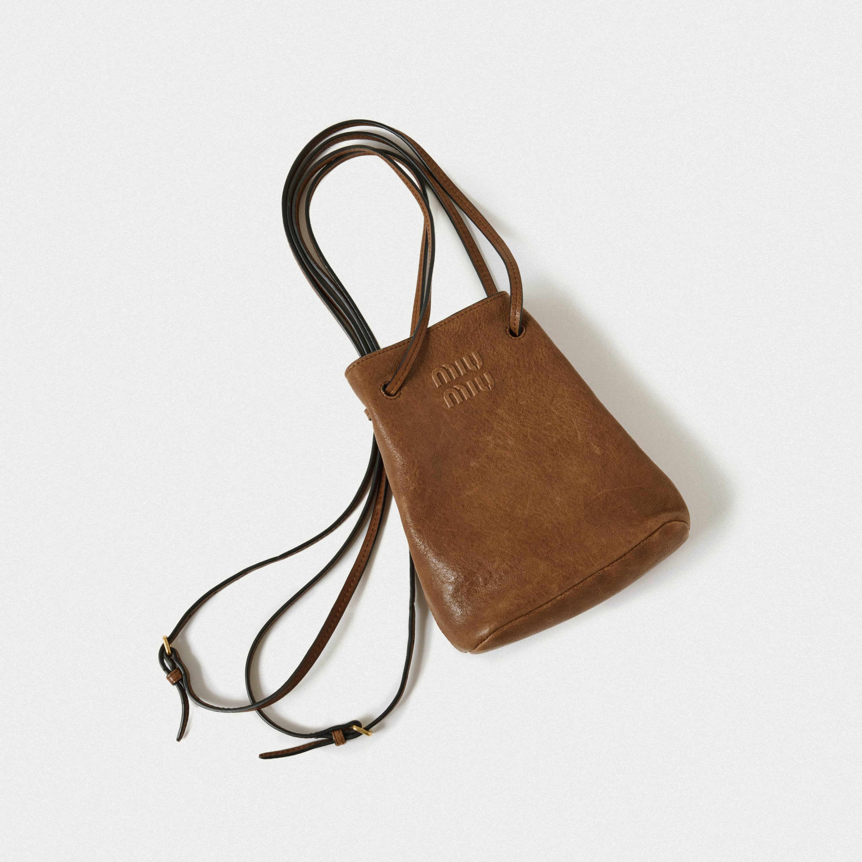 レザーアイテムを持つならば、大きなバッグよりも断然ミニバッグ派。革小物に対して、重たいなとか扱いに気をつけなきゃ……と感じるよりも、アクセサリー的な感覚でお気に入りを身軽に身につけていたい性分です。こちらは急に肌寒くなりレザーの質感が恋しくなってきた時に見つけた〈MIU MIU(ミュウミュウ)〉のミニバッグ。深みのあるブラウンカラーの柔らかなナッパレザーは、こなれ感があって肩にかけるとストラップ部分が2重になるのでコーディネートのアクセントにもなります。H17×W14cmのコンパクトさながら、マチが6cmもあるので必要最低限のものはしっかり収納できるサイズ。エンボス加工のロゴもアイコニックです。革ってクラフトっぽくなりがちなのに、そこはかとなく洗練さが漂っている。さすがなバランス!