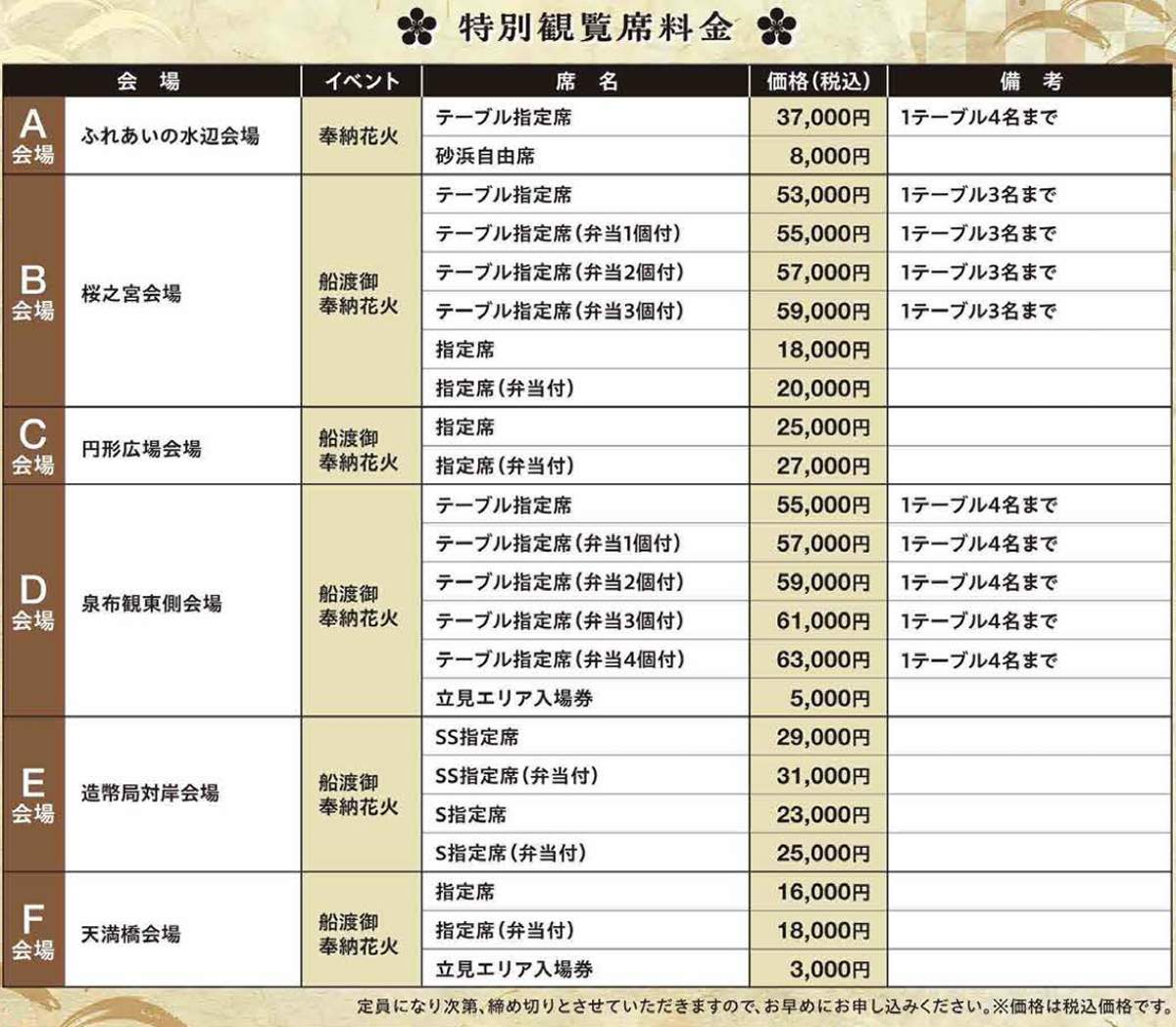 「混雑を避けて、ゆったりと花火と船渡御を鑑賞したい」という方には、有料観覧席の確保が断然おすすめです。チケットは2025年3月17日から順次販売が開始されており、前日の7月24日まで販売されます(売り切れの場合にはそこで販売終了)。