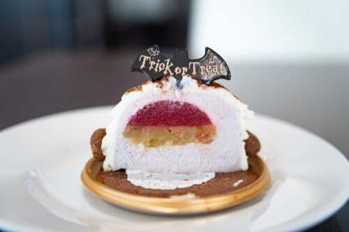 ホワイトチョコレートクリームの中には、ダイス状の芋とベリーのジュレを閉じ込めた紫芋のババロアが。秋らしい芋と見た目を楽しめます。
