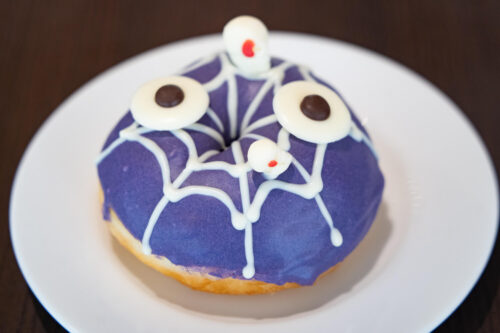 ドーナツは、表面の紫コーティングに、ホワイトチョコレートで蜘蛛の巣が描かれています。