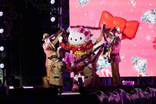 ハローキティは、クリスマスの飾り付けをしに登場。「DECK THE HALLS」を歌いながらピンクのカラーで飾り付けます。