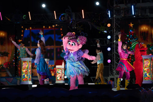 さらに、エルモ、クッキーモンスター、アビーがやってきます。セサミらしくノリノリのクリスマス。「ヘイ!ホー!ホッホッホー!」の掛け声でコール&レスポンスをして、「ジングルベル」の曲に合わせて参加ダンスを行います。