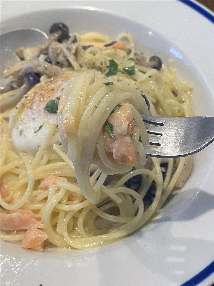 スモークサーモンを使っているのも珍しい。クリームソースに程よいアクセント。温玉の黄身をくぐらせて味変を楽しみました♡