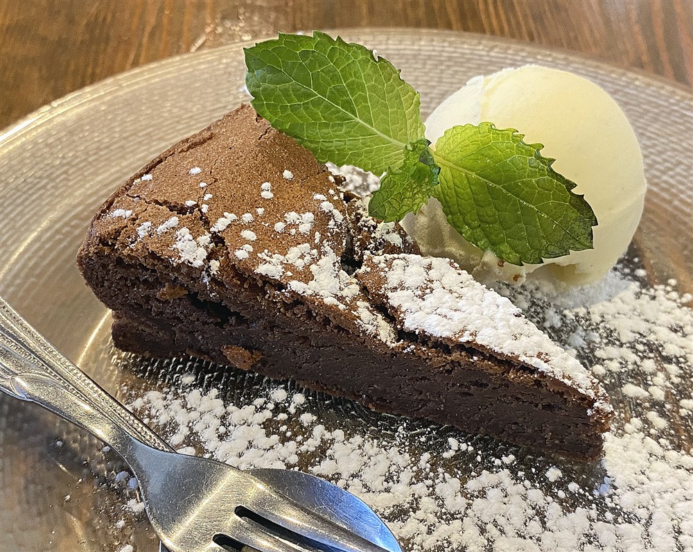 甘みある濃厚チョコにアイスクリームが添えられ、一緒に食べるとバニラとチョコが溶け合って豊かな味わい。