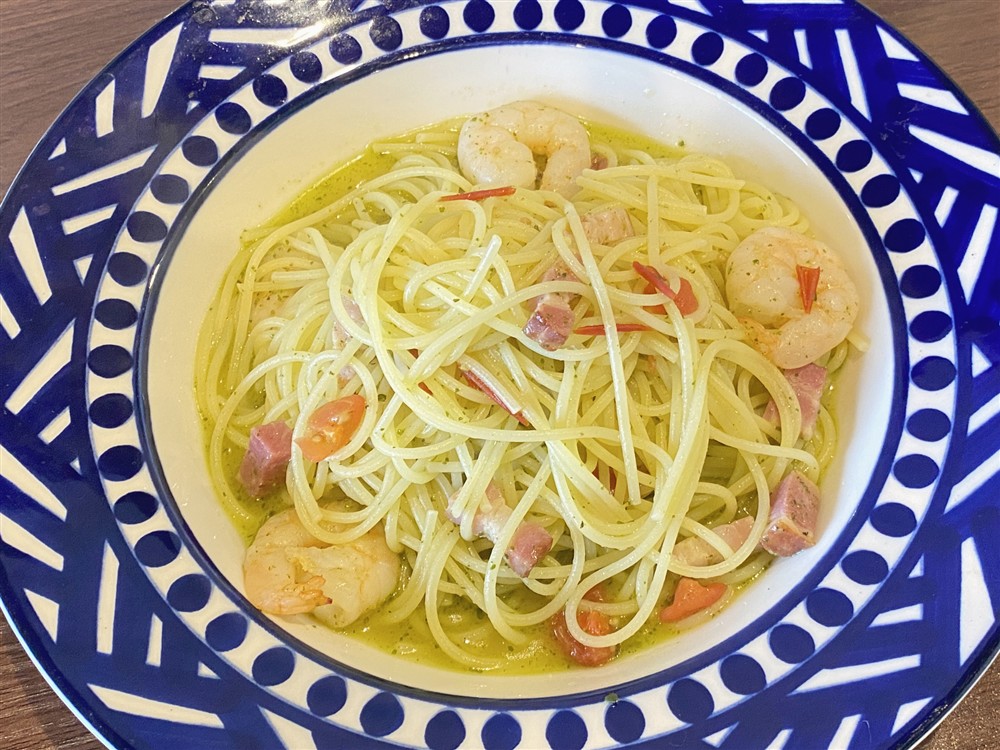 こちらも夏シーズンのメニューで「ベーコンとエビのジェノベーゼ」。