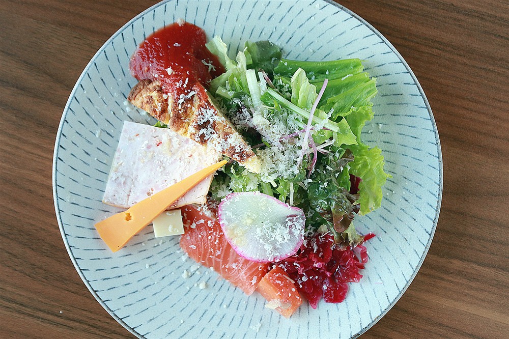 この日は、キッシュにハム、チーズのスライス、サーモンに葉野菜や赤キャベツの酢漬け。