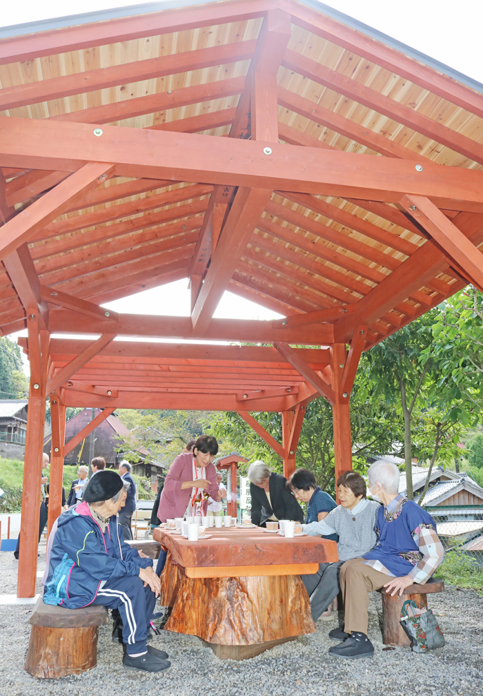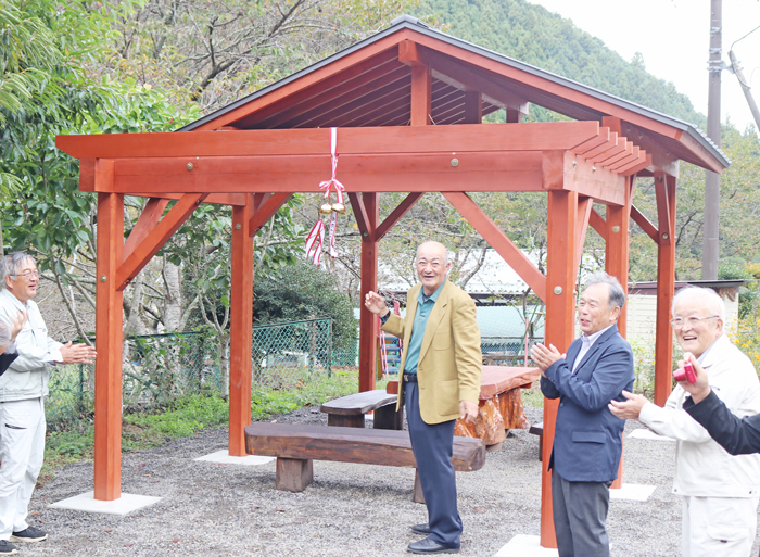 10月13日の竣工式には住民ら約20人が出席し、完成を祝った。成瀬義之区長(69)は「皆が気軽に集える場所として、長く愛される東屋になってほしい」と思いを語った。
