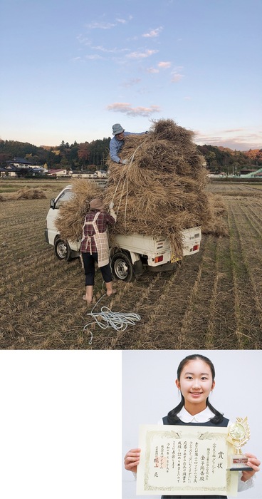 3年前、祖父の岡村曻一さん(80)は脳梗塞に倒れたが、懸命なリハビリを経て同年も米づくりをしたという。「いつも送ってくれて食べてるお米が、命を懸けてつくられているものだと気づいた」という金子さんは、祖父母の働く姿を記録に残そうと、昨年11月に今回の写真を撮影した。タイトルは「つながる命」。トラックに積み上げられているのは脱穀したあとの藁の束で、この後牛の餌になることからこのタイトルを付けた。