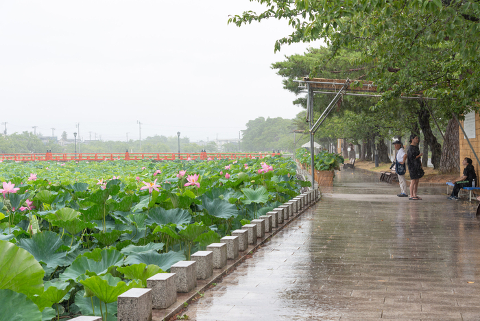 《画像:観蓮会会場の高田城址公園で雨やどりする人(同午前10時頃)》