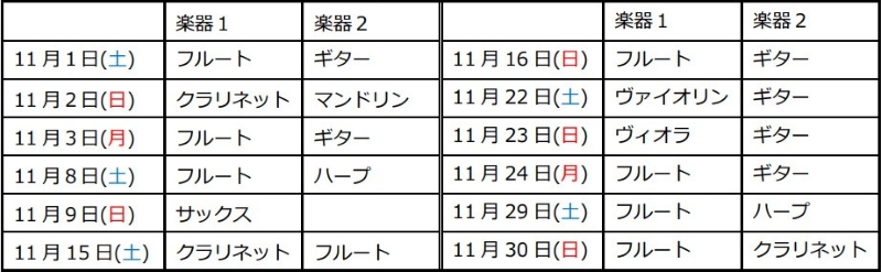 演奏される楽器は日によって異なります。フルートとギターの組み合わせや、クラリネットとマンドリン、ヴァイオリンとギター、サックス(単独)、フルートとハープなど、多彩な組み合わせが予定されています。もちろんプロの方による生演奏!