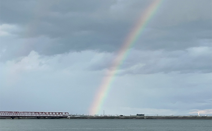 厳しい状況の中キャストを繰り返す忍耐の時間、ふと見上げると東の空にかかる虹。遠くで時雨れているようで、この光景も広いフィールドでの釣りならでは。何だか幸せな気分になりますね。
