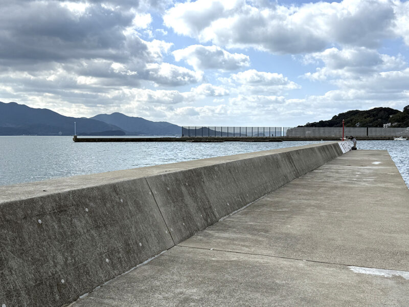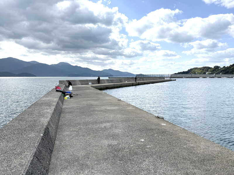 堤防は途中で「くの字」に折れ曲がっているのが特徴。写真の左手が外海側、右手が港内となっており、どちら側でも釣りができるのも魅力なのです。
