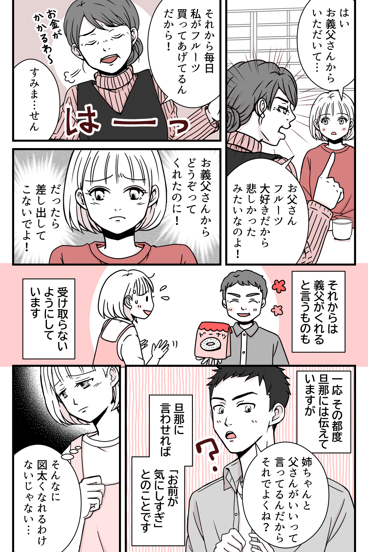 義母から伝え聞く愚痴の内容は、私にとってモヤモヤするものでした。モモカを預かりたいと言い出したのは義姉なのに……。遠慮する私に対して「自分の娘が、モモカのことが大好きで遊びたいと言っている」とたしかに言ったと思います。しかし義母に愚痴を言っていたとすると、もっと強く断ることが正解だったのでしょうか。 義父が「フルーツをくれる」と言ったのも、「悲しかった」と聞いて首を傾げます。 断ればよかったのでしょうか? どうすればよかったのか。正解がわからないので、距離を取ることしかできません。
