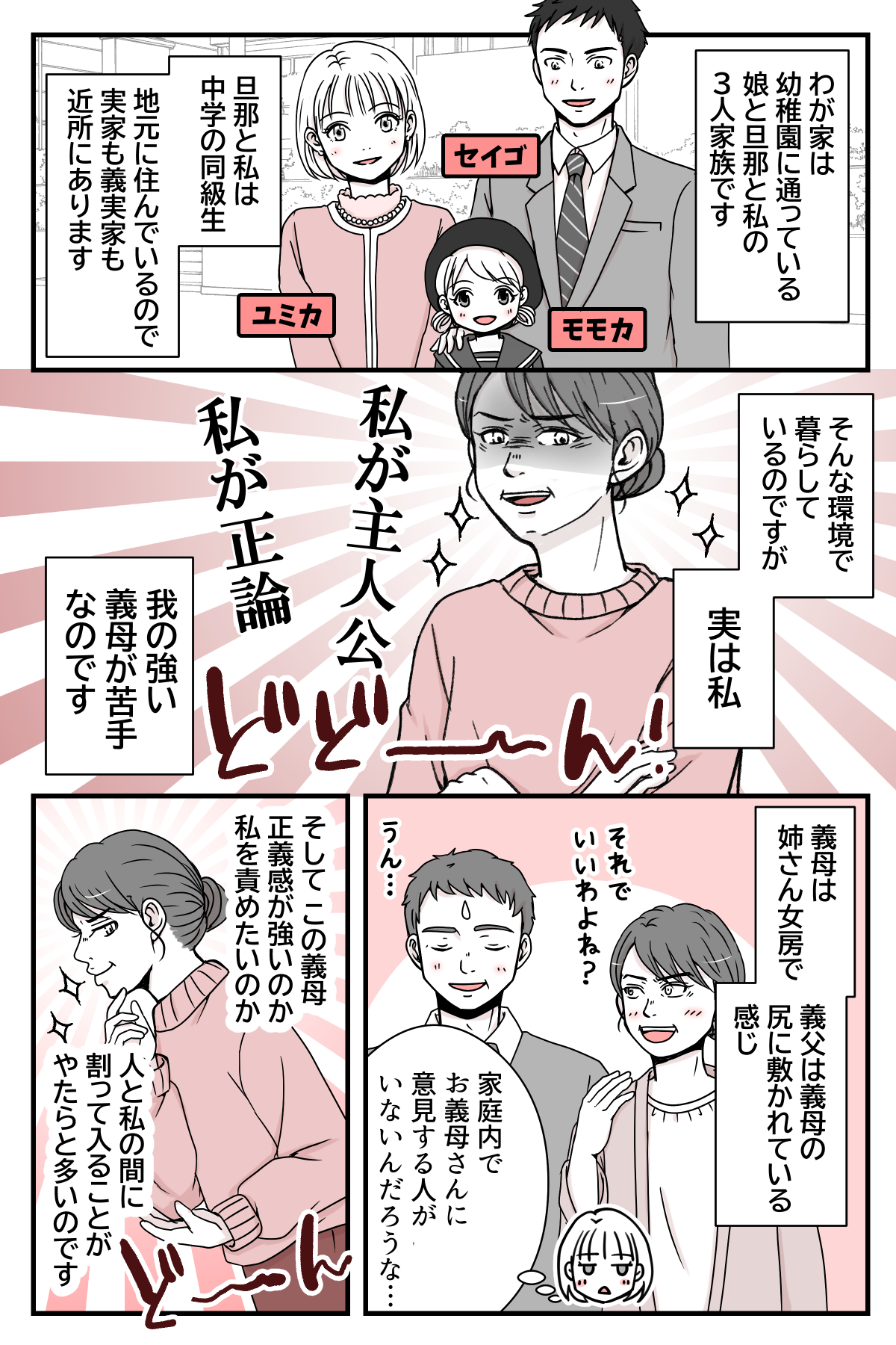 私(ユミカ)は娘(モモカ)と旦那(セイゴ)と3人家族です。私は義母が苦手。義母が言っていることは正しいと思う反面、義母と話をするといつも私が至らない人間だと知らしめられるような気がするのです。私は普通だと思っていたことも、義母からしてみれば「マナー違反」。義母は賛同を求めるように周りへ聞こえるよう話をするので、二重で苦しくなります。旦那が理解してくれていればもっとストレスを感じなかったのでしょうか。旦那もやはりどんなときでも義母が正しいと思い込んでいるのです。