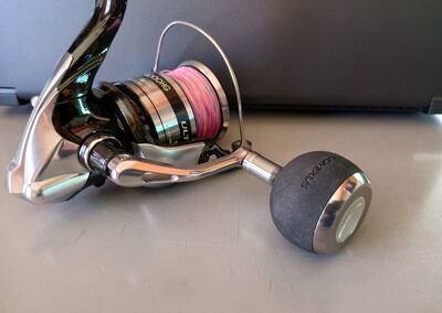 そもそもはオフショア用の8000番とか10000番とか、ジギングなどに使用するパワーゲームが大前提の、“デカいスピニングリールに付いている”のがパワーハンドルノブである。バスやシーバスで使う小型~中型スピニングリールのノブの保持が「つまむ」という表現なのに対して、「握る」という表現がしっくりくる、かなり存在感が大きい代物だ。