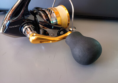このソフトバットキャップ、本来は竿尻に装着して、地面に置いたときに傷が付くのを防ぐ&ショックを吸収するという役割があるのだが、この最小サイズ「BRC19.0R」が、当時私が使っていたシマノのスピニングリールのノブに見事にハマり(多少の隙間は水道用のシールテープを巻いて対処)、いともかんたんにパワーハンドルノブ(っぽい)見た目が実現できたのである。