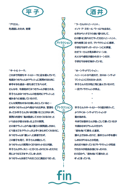 現時点で、平子さんはディズニーシーに行き、「シンドバッド・ストーリーブック・ヴォヤッジ」と「アリエル」に、酒井さんはランドに行って、「イッツ・ア・スモール・ワールド」に行ったところまで話は進行中。
