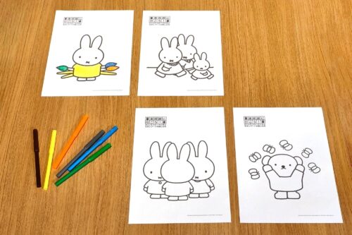 展覧会を見たあとは自分の手で楽しむコーナーも。ぬりえや色紙を使用したブルーナの手法体験で、作品を作れます。