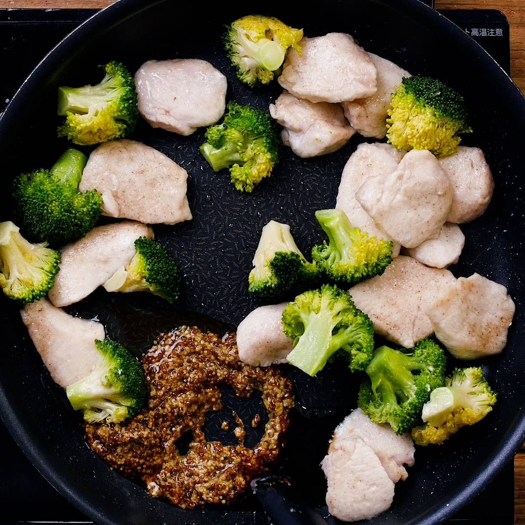 2: フライパンにサラダ油を熱し、鶏むね肉を入れ軽く炒めます。ブロッコリーを加え、さらに炒めます。