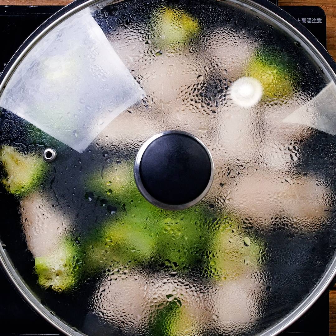 3: 酒を入れてフタをし、弱中火で4〜5分ほど蒸し焼きにします。時々混ぜて様子を見ながら加熱してください。