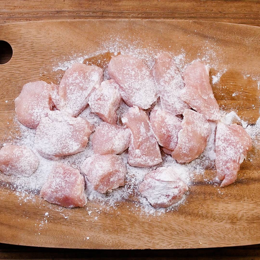1: 鶏むね肉はひと口大に切り、味付塩こしょう、片栗粉をまぶします。