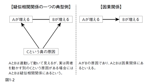 一方、「相関関係」というのはただ単に、いくつかの数字の変動が連動していることだけを指します(相関関係には、因果関係も疑似相関関係も含まれます)(図1-2)。数字と数字の間の相関関係は、もちろん、高い確率で何らかの因果関係がその背後にあることを予想させます。ただ、断言はできない。まったくの偶然である可能性さえ、少しは残っている。したがって、相関関係は「ここが怪しいぞ」という印でしかない。
