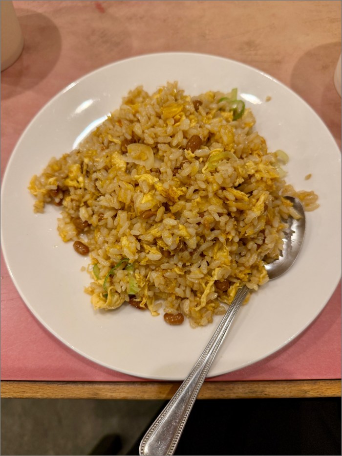 バッチリです。出前もウマイけど、店で食べる納豆チャーハンもまた最高。スープとか何もないって無骨さも最高。こうなると、また出前版も食べたくなってくるなぁ……。