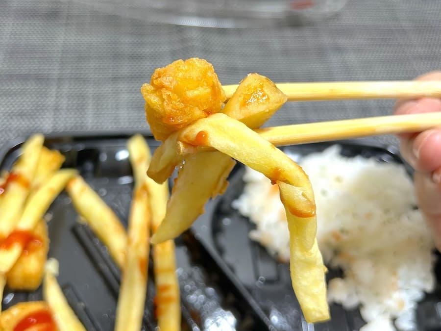 それぞれを単体で食べる分には可もなく不可もなく。王道のフライドポテトと白ごはんです。