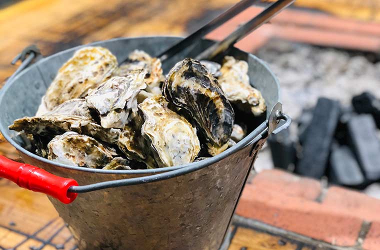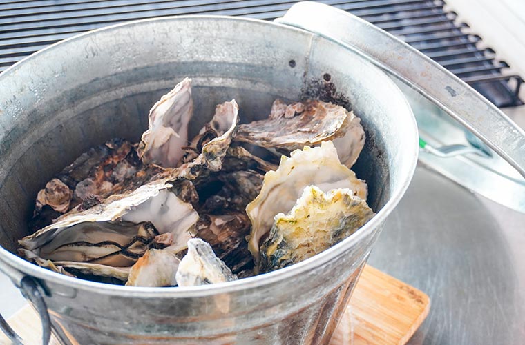 名物の『牡蠣バケツ』にも注目を!1.3kgの殻付き牡蠣が入ったバケツを購入し、卓上のカセットコンロでバケツごと蒸す“究極の漁師めし”です。バケツの蓋を開けると牡蠣一つひとつの大きさと量に圧倒されるはず!熱々でプリプリの蒸し牡蠣は、そのままでももちろん、レモン汁をかけて食べるのもおすすめです。レモンの酸味が牡蠣の凝縮したうま味とベストマッチ。