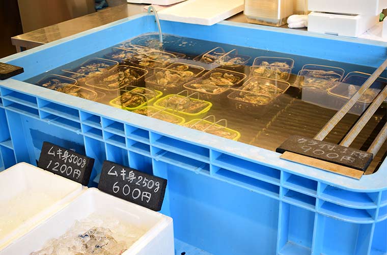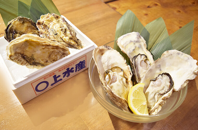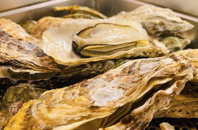 「〇上水産」では、いつでも新鮮な牡蠣が食べられるように、季節に応じて全国各地から仕入れています。兵庫県では室津や坂越、そのほか北海道や九州、東北など。時期や産地によって金額の変動があるので、店員さんに訪ねてみて。