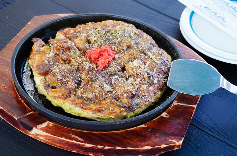 看板メニューの『牡蠣焼き(お好み焼き)』にも牡蠣がごろごろ!山芋やキャベツをたっぷり混ぜ込んだふわとろの生地の中だけでなく、仕上げに大粒の蒸し牡蠣ものせて香ばしく焼き上げています。