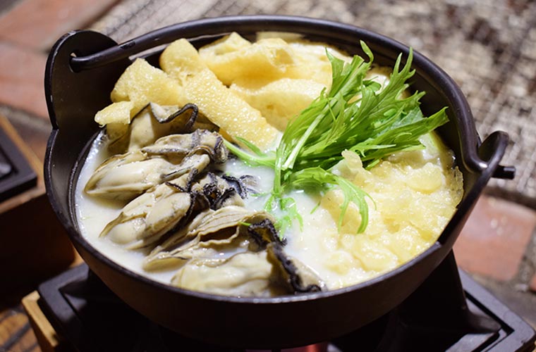『おっぱい鍋』のネーミングの由来は、山のミルク「牛乳」と海のミルク「牡蠣」がコラボレーションしていることから。スープは白みそベースで、ボイル牡蠣のだしや牛乳、酒かすが入っていてコクを引き出しています。具材には野菜と大粒でプリプリの牡蠣が。寒い時期に食べたくなる一品です。