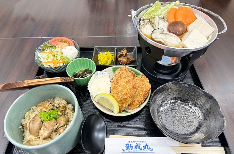牡蠣の養殖業で有名な「勤成丸(きんせいまる)」が営む姫路市網干区のオイスターキッチン。瀬戸内海に隣接する網干港のグルメスポット「網干じばさんひろば 魚吹津(うすきつ)」内にある同店では、前どれの牡蠣を使った定食やお好み焼きが味わえます。