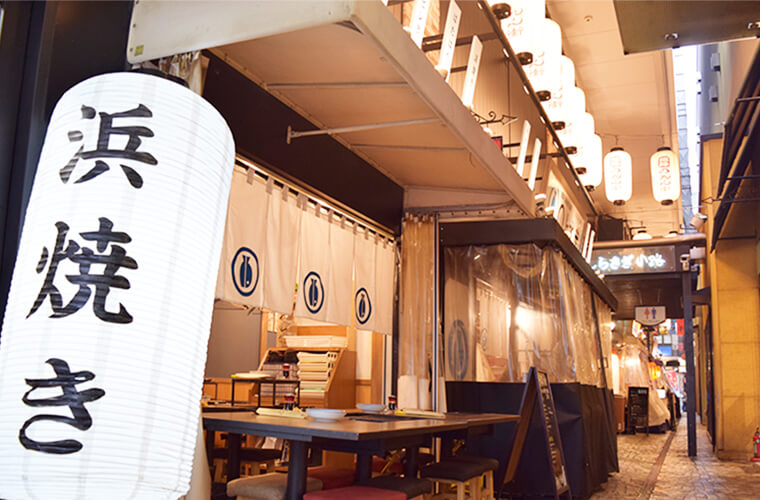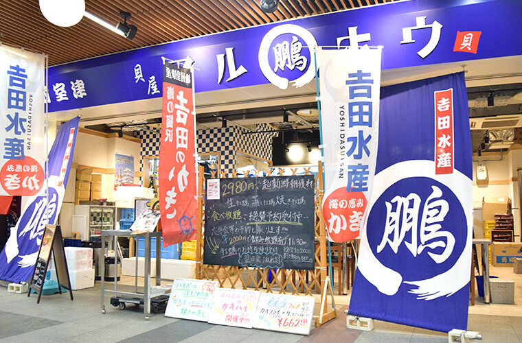 姫路駅の地下街、グランフェスタ6番街にある貝専門店「貝屋 マルホウ」。播州室津「吉田水産」の牡蠣を中心としたさまざまな種類の貝が1年中堪能できます。
