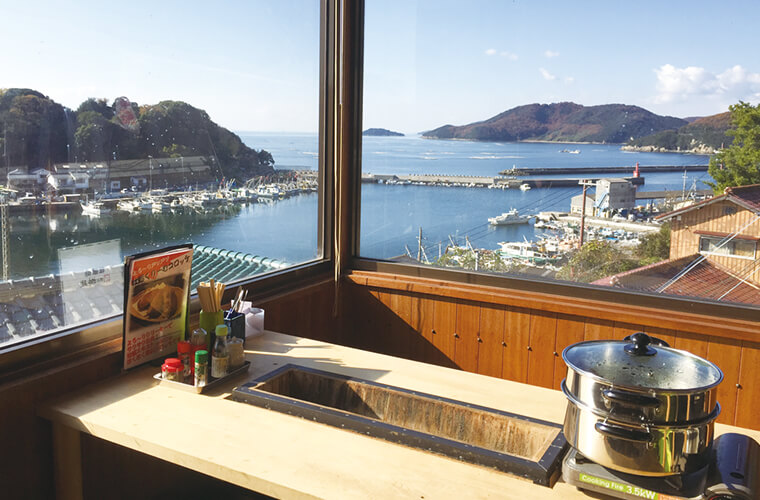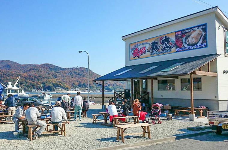 赤穂市坂越(さこし)の海沿いにある「くいどうらく」。その日に水揚げされたばかりの「坂越牡蠣」のほか、新鮮な魚介を使った料理が楽しめます。
