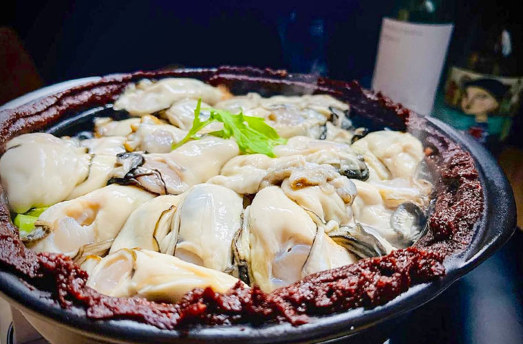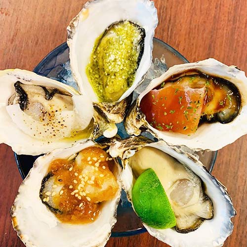 自慢の牡蠣は焼き牡蠣でいただくのがおすすめ。同店オリジナルの『オイスター焼き』は、焼くことでうま味が凝縮され、ぷりぷりの食感が生まれます。同店オリジナルの創作焼き牡蠣は、ジェノベーゼ 、あぶりめんたい 、わさびマヨ 、レモンペッパー 、ネギ醤油の5種類をスタンバイ。なかでも一番人気はネギ醤油だそう。