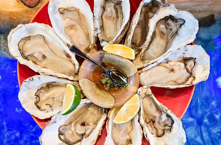 生牡蠣に特製ソースがかかった『彩り生牡蠣』がインスタ映えすると話題に。すだちソルト、梅おろし、柚子胡椒オリーブオイル、カクテルソース、ジェノベーゼソースから選べます。