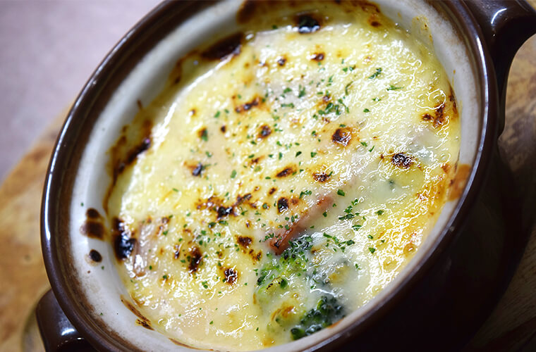 牡蠣やブロッコリー、ベーコンなどが入った具だくさんグラタン。牡蠣は炒めてからホワイトソースをかけて焼きあげているので、うま味が凝縮されています。ホワイトソースと牡蠣の相性が抜群で、女性に人気の冬季限定メニューです。