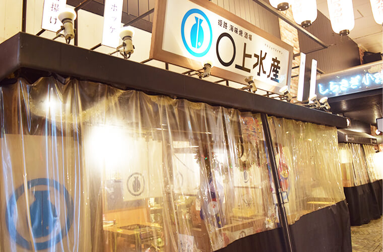 山陽・JR姫路駅から北へ徒歩2分。フェスタビル1階の「姫路のれん街」に店を構える「〇上(マルジョウ)水産」。まるで海辺の牡蠣小屋のような雰囲気たっぷりの店内で、1年中牡蠣を中心とした浜焼きが楽しめる人気店です。敷地内にはカウンターで味わえる寿司の店「姫路 酒肴 魚寿司(うおずし)」も。