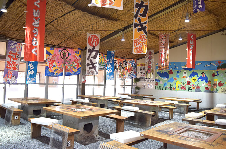 牡蠣小屋は、イートインスペースにテントが設置されていて寒さ対策もバッチリ!新設されたばかりでトイレ等の設備もきれいなので、快適に過ごせますよ。