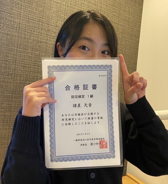 中1で防災士の資格を取得し、中3で大学卒業以上の難易度とされる防災検定1級(アドバイザーとして講演可能なレベル)に合格。スキーも得意でスキー検定は2級、現在は1級を目指しています。