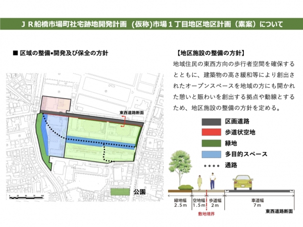 船橋市では、開発計画に合わせて地区計画(都市計画法に基づくまちづくりツールの一つで、概ね街区単位で指定し、建築物等に対しきめ細やかな規制・誘導を図る)を指定している。同計画では、周辺住環境に配慮した建物用途規制(風俗営業系施設や物流施設、自動車修理工場等の建築制限)や一部で高さ制限の緩和等を行うことで、東西方向の歩行者空間の確保や地域に開かれたオープンスペースの確保などを図り、住環境に優れつつ環境や防災に配慮したエリアをつくろうとしている。