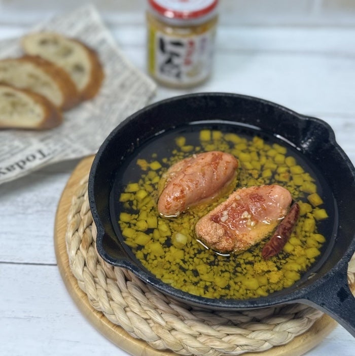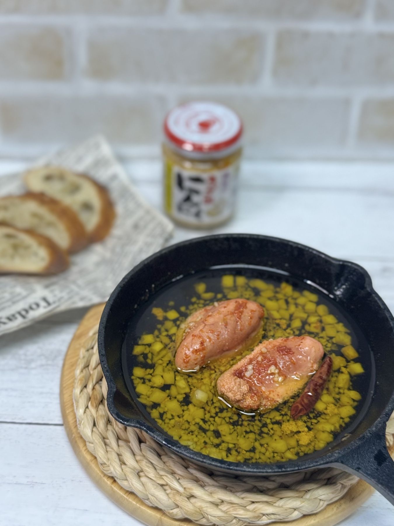 熱々のオリーブオイルに明太子と「きざみにんにく」をたっぷりと!