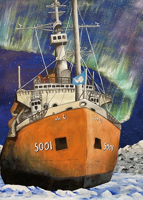 空に輝くオーロラは、刷毛を使って試し塗りをするなど、慎重に制作に取り組んだ。船上には二人の観測隊員が描かれており、「一人は自分のつもりで描いた」と制作意図を明かした。