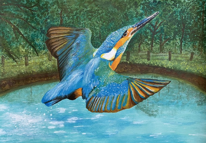 市長賞を受賞した直大さんの作品は、「空飛ぶ宝石」とも呼ばれる青い鳥・カワセミを描いたアクリル画。
