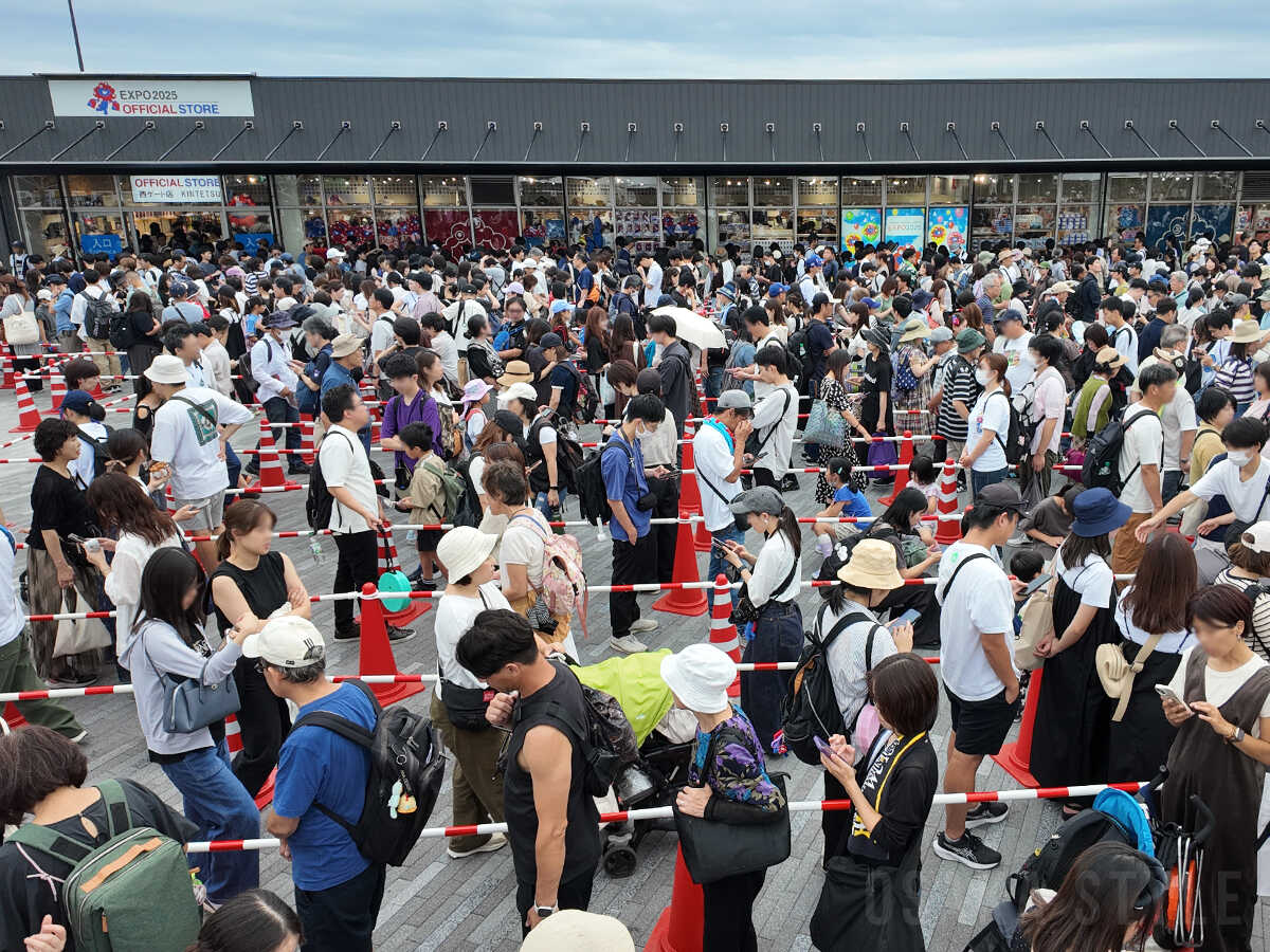 大阪・関西万博会場(大阪市此花区)にあるオフィシャルストアでは、公式キャラクター「ミャクミャク」のグッズなどが販売されており、連日行列ができている。