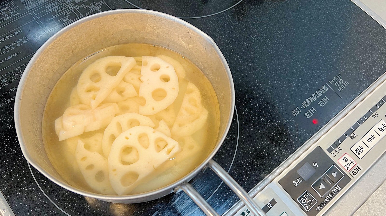 1 鍋にだし汁と、皮を剥いて食べやすく切ったレンコンを入れて中火にかける。