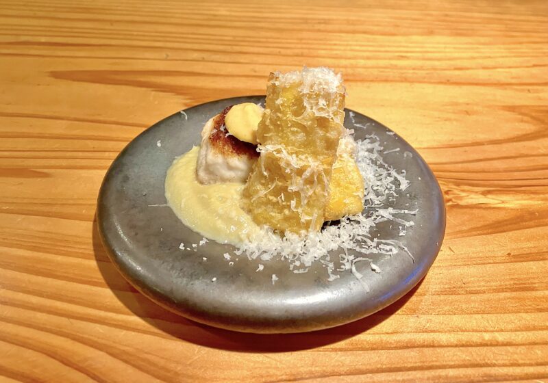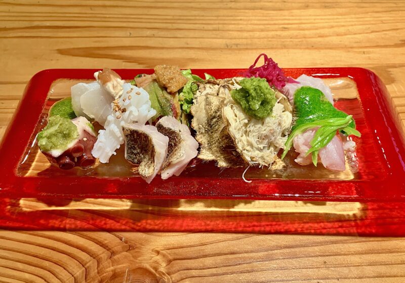 ガラスの器に盛られきたのは一見すると刺身の盛り合わせだが、彩りの豊かさにただのお造りではないことが分かる。マダイ、地ダコ、ヤリイカ、タチウオ、クリガニ、ホウボウ、キンメダイといった鮮魚に、それぞれ異なるソースや薬味を合わせているのである。それもマダイにはサワークリームと梅肉、タコにはフェンネル、カニには摺り下ろしたキュウリなど、素材同士の組み合わせが絶妙で、旬の味を楽しむ冷前菜としては白眉の出来映えだ。
