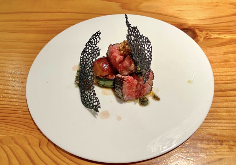 肉料理はA5ランクの鹿児島産黒毛和牛の赤身を、低温でじっくり火を通したローストビーフ。それに甘味の強いジャガイモ・デストロイヤーとズッキーニーを合わせるなど、舌から伝わってくる情報量の多さに頭が追いつかない...が、こんな時には美味しい赤ワインをグビッと飲めば、たいていは解決する。要するに、旨けりゃなんでもありなのだ!